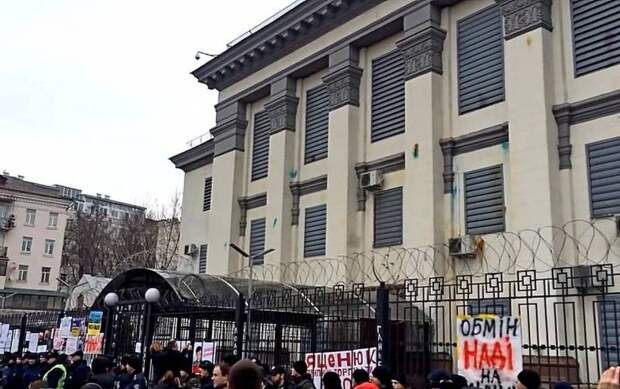 Посольство РФ в Киеве, возможно, готовится к захвату или эвакуации. Над российским посольством в Киеве виден дым. Горят костры из папок с бумагой, идёт уничтожение документации