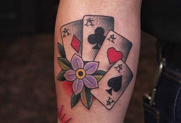 В мире организованной преступности у каждой игральной карты есть свое значение. Поэтому татуировка в виде нескольких карт способна подробно рассказать о преступлениях ее обладателя, его опыте в местах заключения и силе его авторитета. Если значения карт не совпадут с жизненным опытом хозяина татуировки, то это будет воспринято как ложь и самозванство.